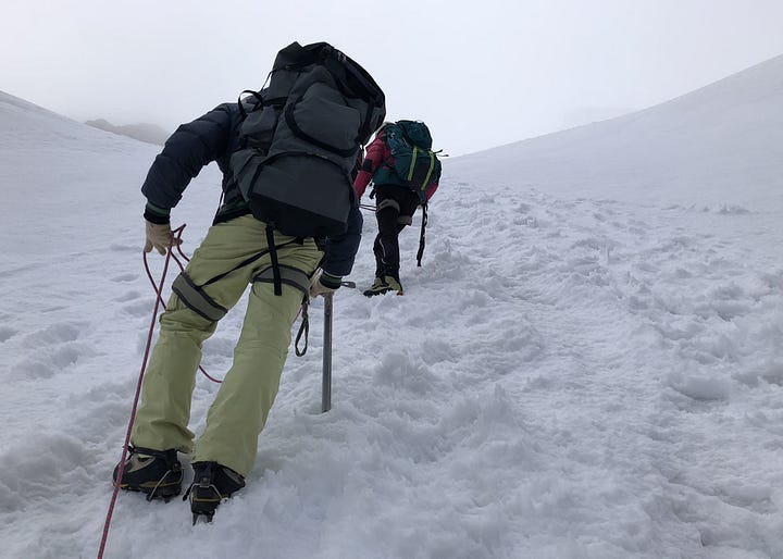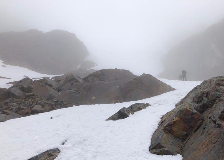 Scegliamo di fare una cosa per principianti, il Nevado Mateo che ha il suo punto di arrivo a 5400m. La sveglia è alle 3 per poter fare le 2 ore di macchina che ci separano dall’inizio della scalata. Arrivati li mettiamo i rampini di ghiaccio e le scarpe da neve nello zaino. Subito dopo indossiamo le brache di sicurezza e impugniamo la piccozza. Cominciamo la salita sulla parte rocciosa, umida, scivolosa e con poco spazio dal dirupo e da una caduta misera. Ogni tanto ci sono gli sprazzi di neve misti al muschio. Durante la salita il freddo aumenta per le condizioni climatiche e le nubi sembrano volerci inghiottire con il loro movimento dall’alto verso il basso. Mentre cammino scivolo e mi bagno un guanto. Arriviamo alla base del ghiacciaio. Cambiamo i nostri strumenti prendendo dalla borsa quello che ci serve e mettendo da parte quello che ci servirà per il ritorno. Cambio il mio guanto ma la mano fa malissimo, la apro e la chiudo ma nulla cambia. Intorno tutto si fa più grigio e vedo delle piccole figure che ci precedono sparire nella nebbia.
