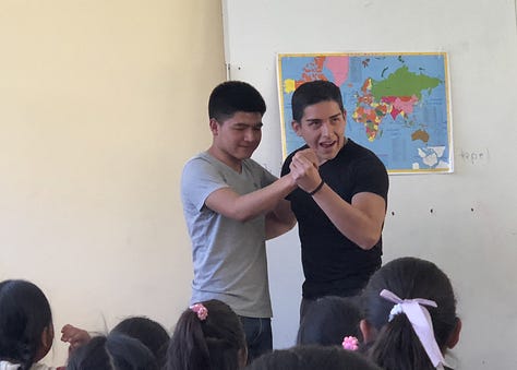 Dopo l’addio dei francesi abbiamo portato avanti le giornate nelle scuole per sensibilizzare rispetto all’ambiente e al contrasto alla crisi climatica. Vi erano bambini tra gli 8 e gli 11 anni. Tanti bambini. Le scuole sono spaziose e con molto verde, con animali e un orto. Il problema è che spesso c’è molta spazzatura e delle volte bruciano porzioni di prato per l’immondizia. Abbiamo presentato in nostri paesi, il nostro lavoro, abbiamo parlato dell’importanza di prendersi cura della natura ma soprattutto ci siamo messi tanto in ridicolo.