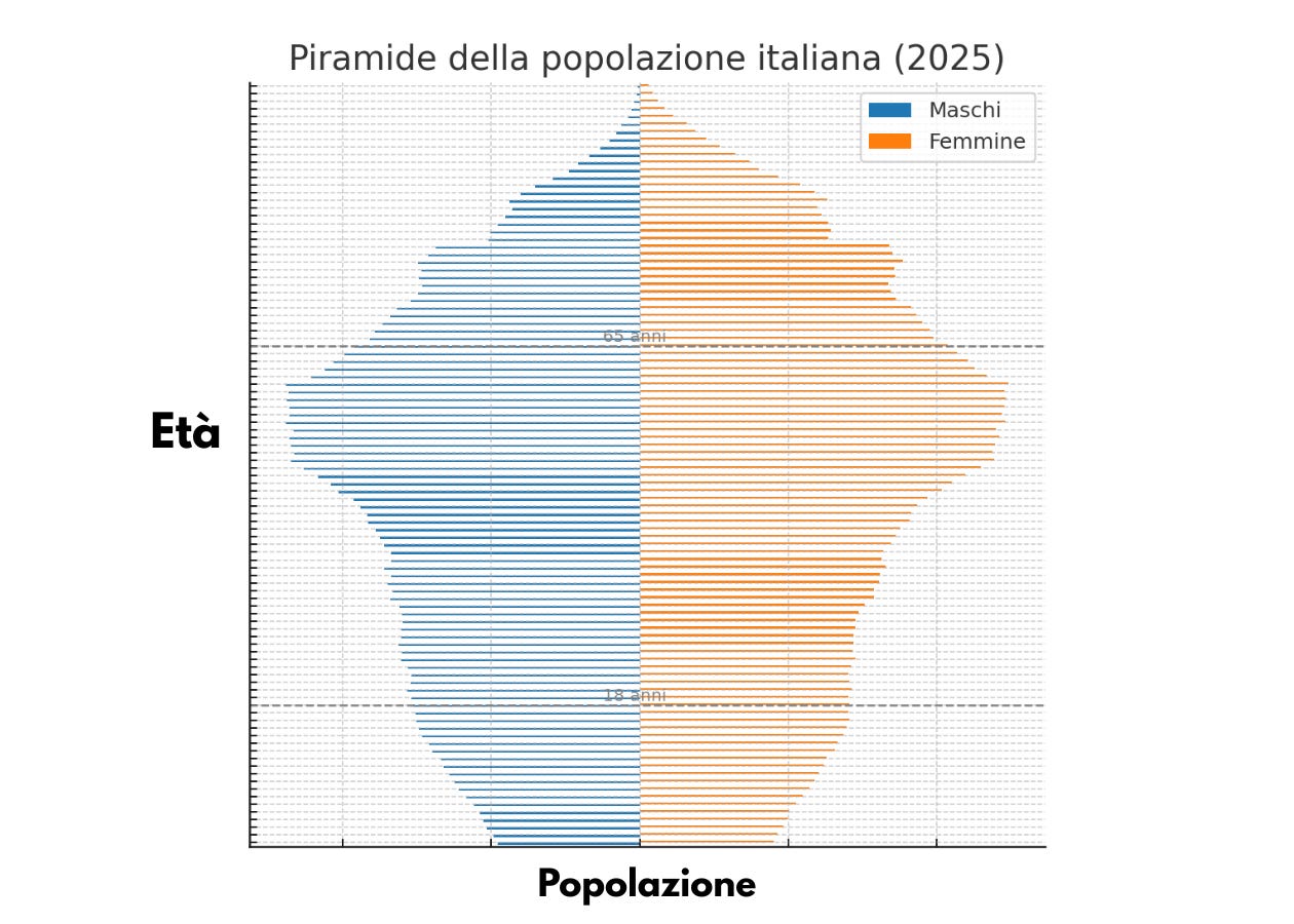 Analizzando i dati sulla popolazione residente in Italia a gennaio 2025, ci accorgiamo che la Gen X (1965-1980, 14.7 milioni) e i Boomers (1946-1964, 13.4 milioni) costituiscono il 48% della popolazione e detengono la maggiore capacità di rappresentanza politica. Seguono i Millenials (1981-1996, 10.8 milioni) e la Gen Z (1997-2012, 9.5 milioni) che insieme costituiscono il 34% della popolazione, mentre il futuro demografico del Paese è rappresentato dalla Gen Alpha (2013-2025, 5.9 milioni) che costituisce il 10% della popolazione.